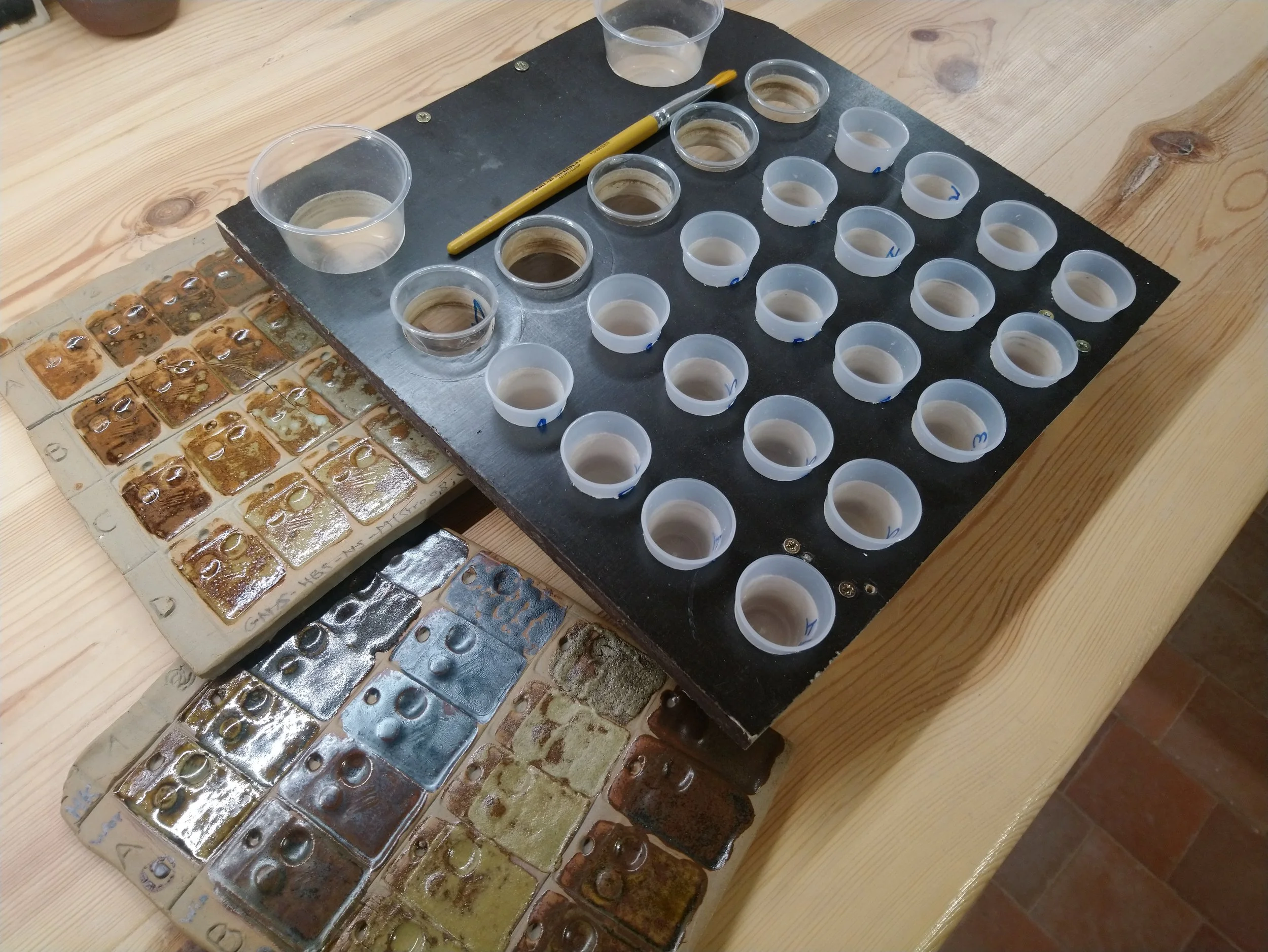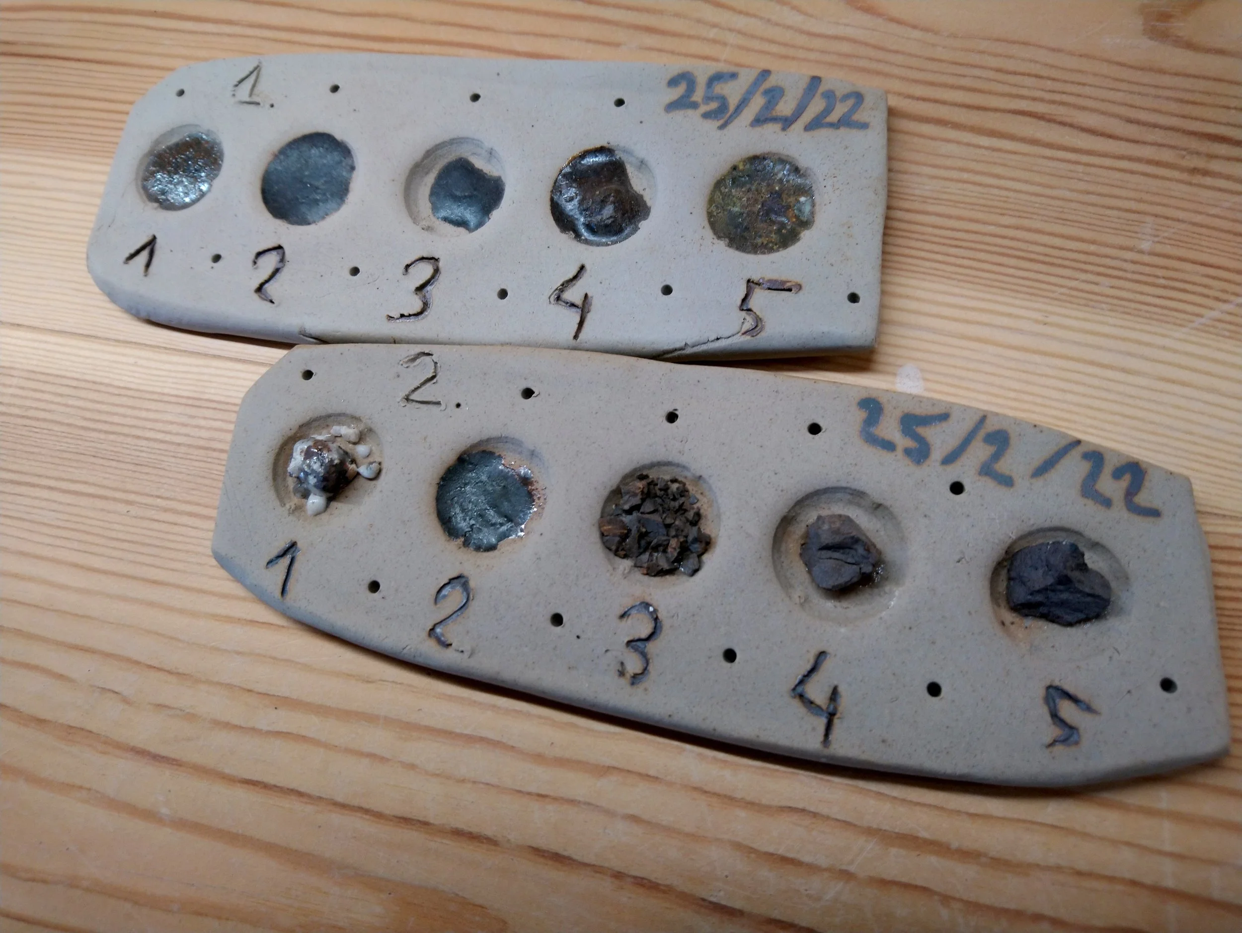 Er loopt in het atelier een permanent project rond glazuren vervaardigd op basis van gesteenten die vrij in de natuur te vinden zijn. Door hun specifieke samenstellingen hebben de meeste gesteenten in de oven maar een klein beetje hulp nodig om te smelten, sommigen deden het lang geleden al eens, diep in de aardkorst. Dan stolden ze, soms apart, soms erg met elkaar verweven. Als we in het atelier de juiste partners terug bij elkaar brengen kunnen we deze gesteenten opnieuw doen smelten. Snel afkoelen levert dan een glasachtige materie, het glazuur van de pottenbakker..