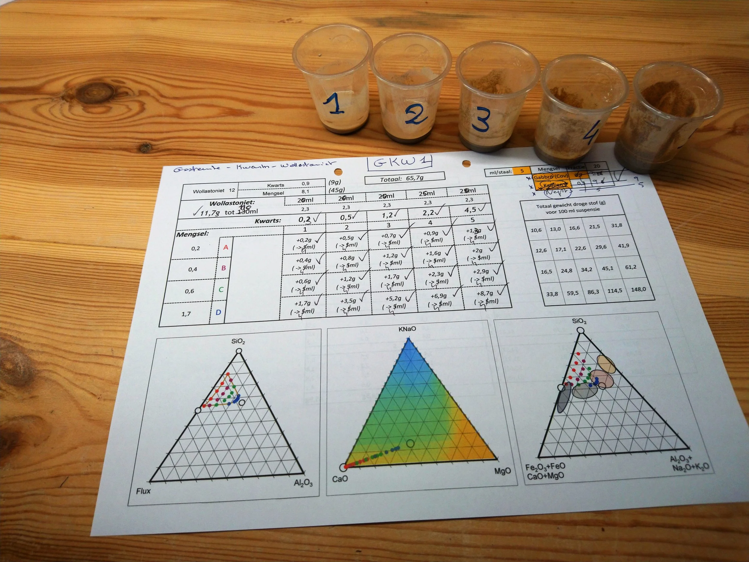 Nu komt het erop neer om de gekozen gesteenten correct te combineren, onderling, met assen van hout of grassen of met eerder ‘klassieke’ grondstoffen. Om samenstellingen te bedenken die, misschien, een interessant resultaat zullen opleveren komt enig chemisch inzicht en kennis van wat een glazuur precies is van pas. Maar ook gezond verstand, bestaande literatuur en de mening van collega‘s zijn van onschatbare waarde. Ondanks alle mogelijke kennis zijn er dikwijls meerdere cycli nodig om een glazuur met de gewenste eigenschappen te bekomen, maar voldoening is, zoals steeds, in verhouding met de inspanningen..